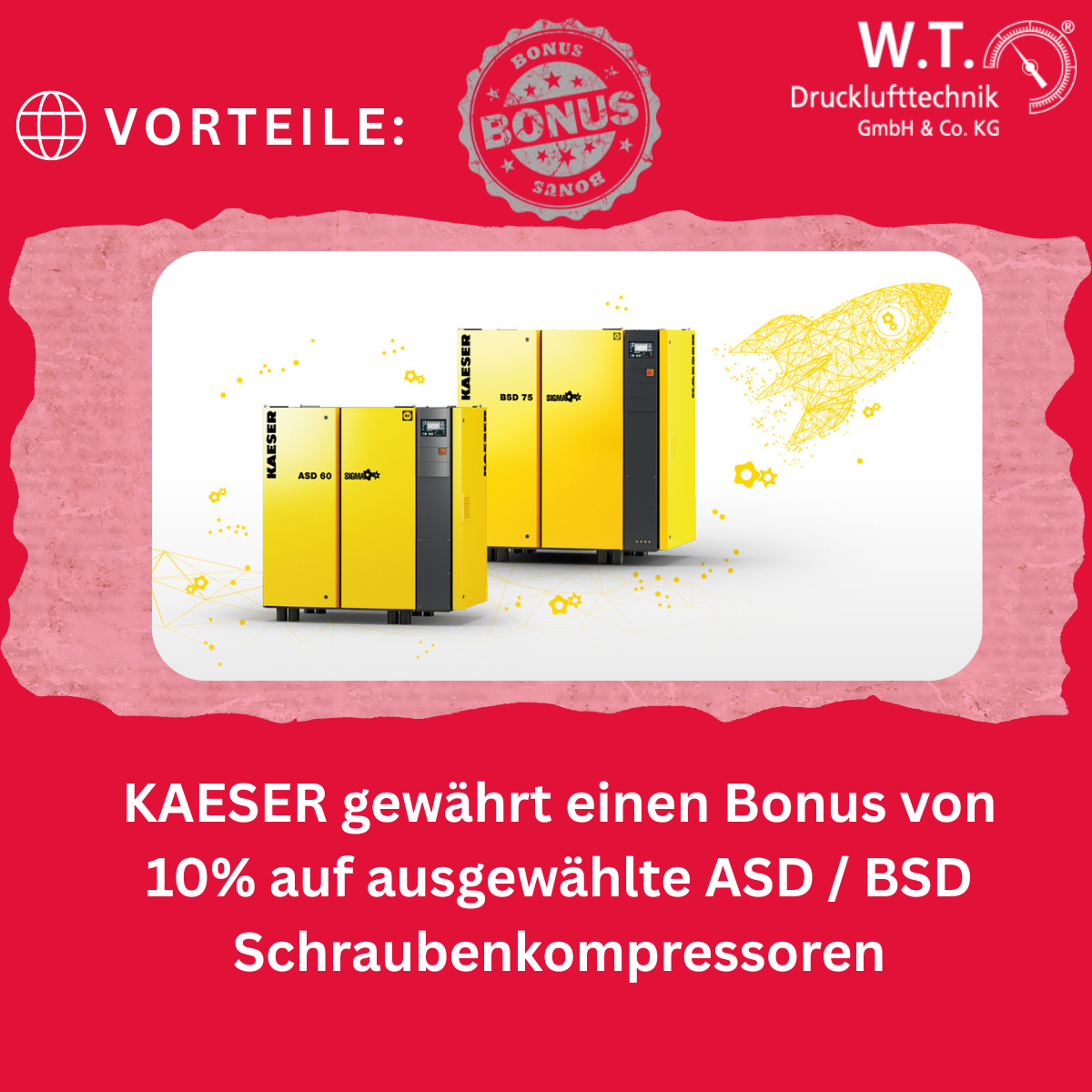 - 10 % KAESER-Bonus auf ausgewählte ASD- und BSD Schraubenkompressoren