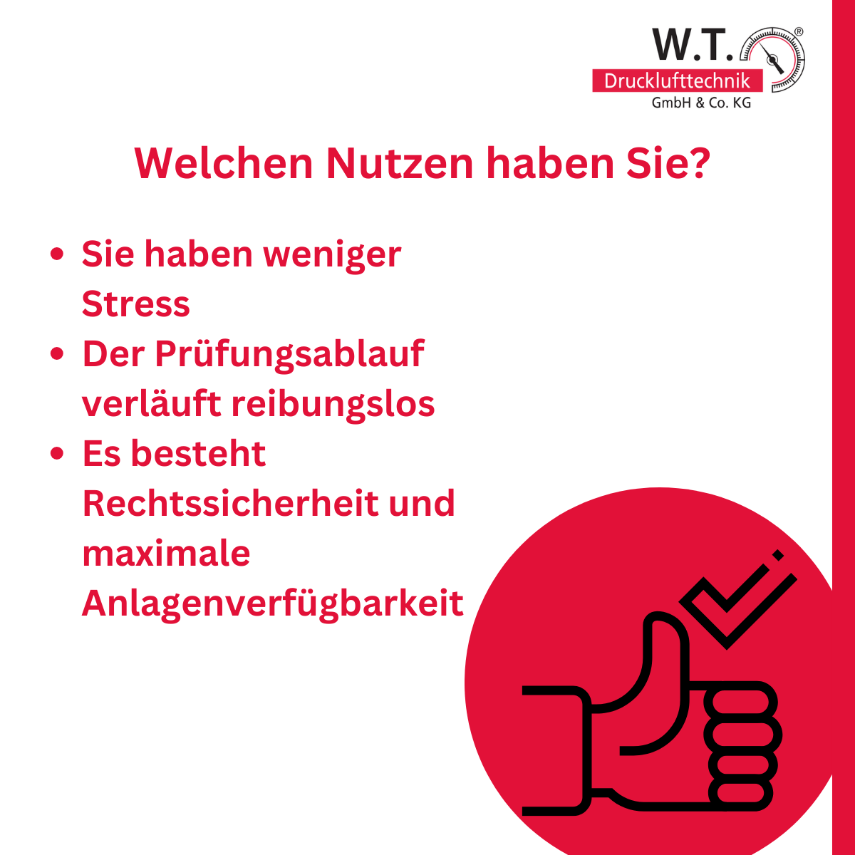 W.T. Drucklufttechnik übernimmt die strukturierte Vor- und Nachbearbeitung Ihrer Druckluftanlage – von der technischen Prüfung über die TÜV-Begleitung bis zur schnellen Mängelbeseitigung.