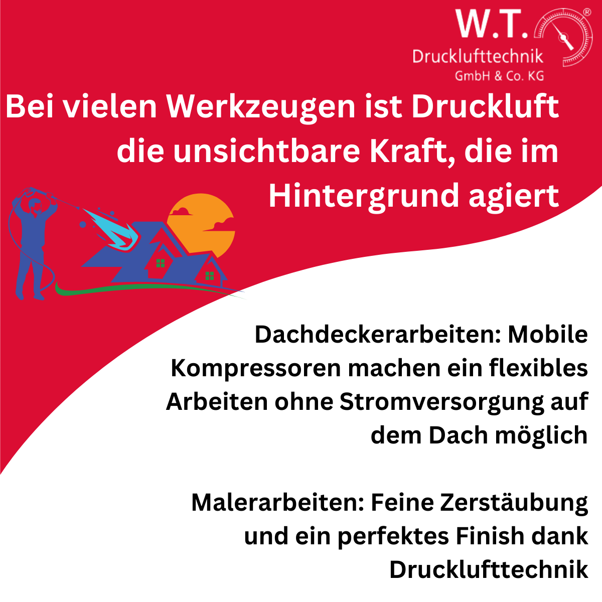 Ob beim Dachdecken, Malen, im Trockenbau oder bei der Dichtigkeitsprüfung – Druckluft ist die unsichtbare Kraft, die tagtäglich Höchstleistungen ermöglicht.