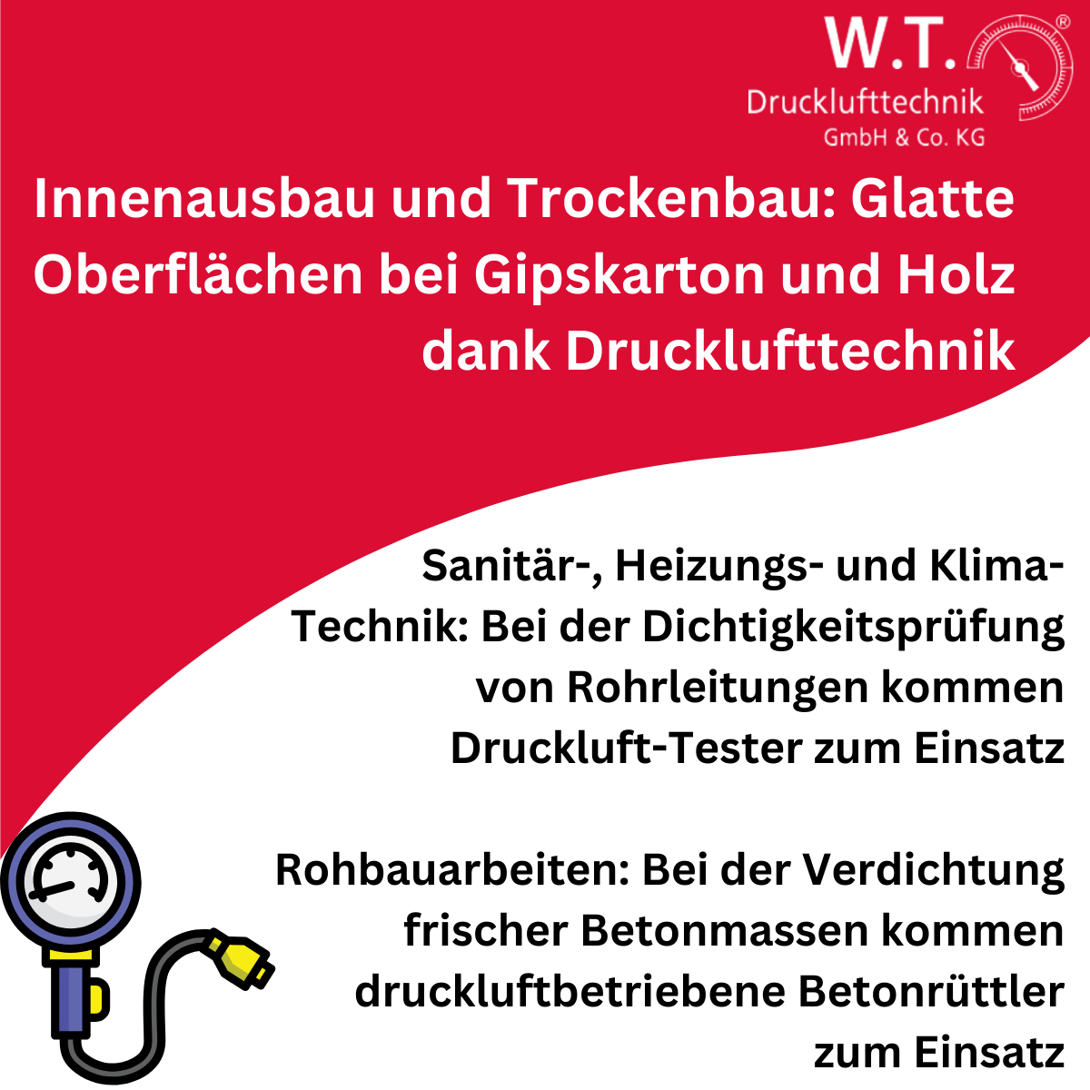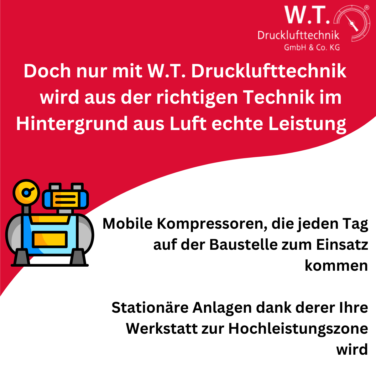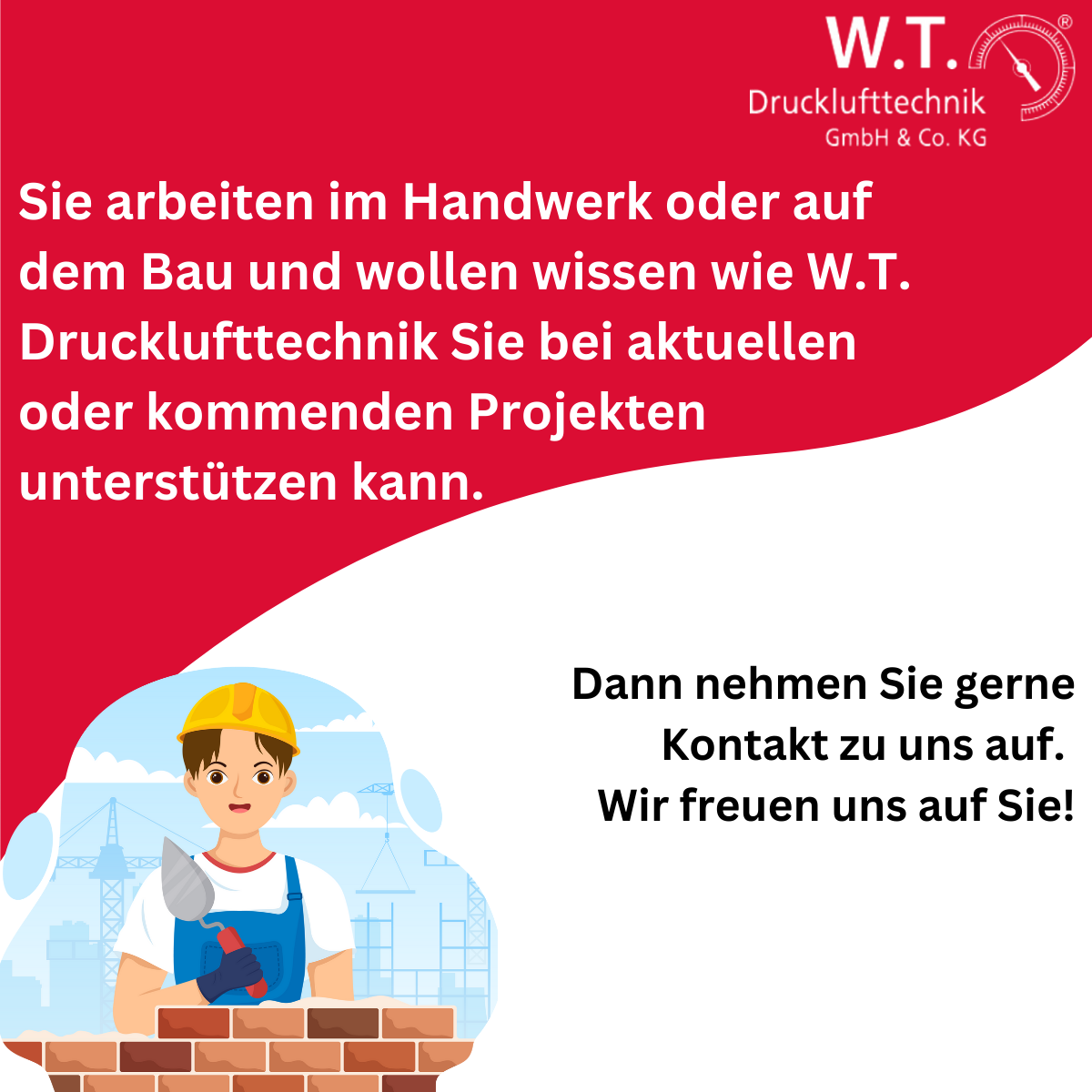 Mit der richtigen Technik im Hintergrund wird aus Luft echte Leistung – und genau dafür steht W.T. Drucklufttechnik. Von mobilen Kompressoren über stationäre Anlagen bis hin zur professionellen Druckluftaufbereitung bieten wir nicht nur Produkte, sondern echte Lösungen für Bau und Handwerk.