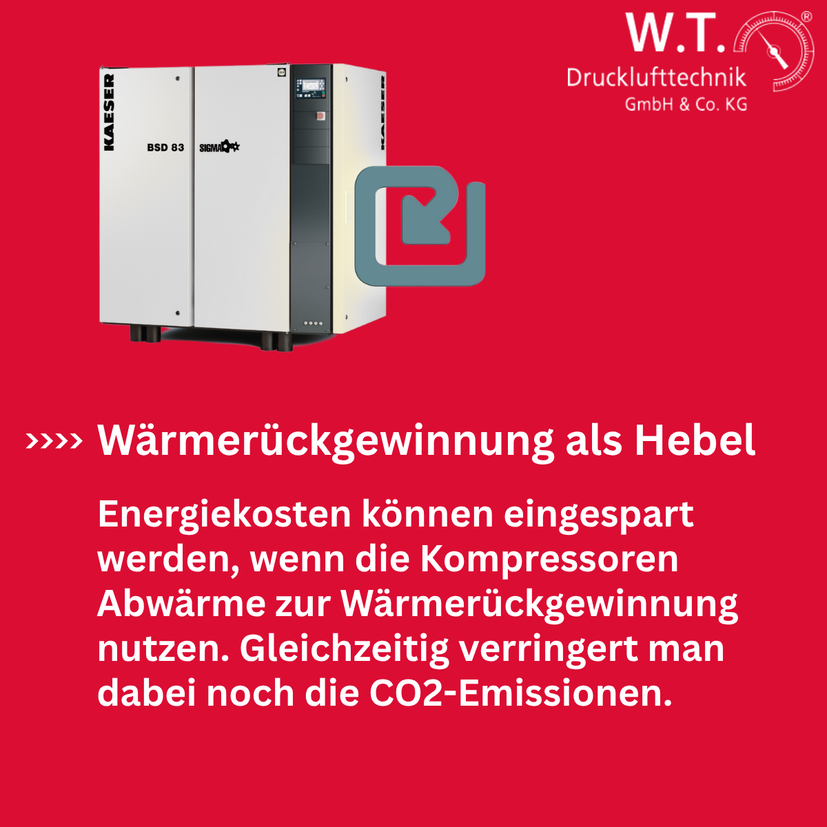 Besonders im Bereich Druckluft schlummert enormes Einsparpotenzial – von Wärmerückgewinnung über Leckagemanagement bis hin zu Effizienztechnologien. In unserem Slider zeigen wir, wie Sie mit gezielten Maßnahmen nicht nur Energie und Kosten sparen, sondern auch CO₂-Emissionen reduzieren können.